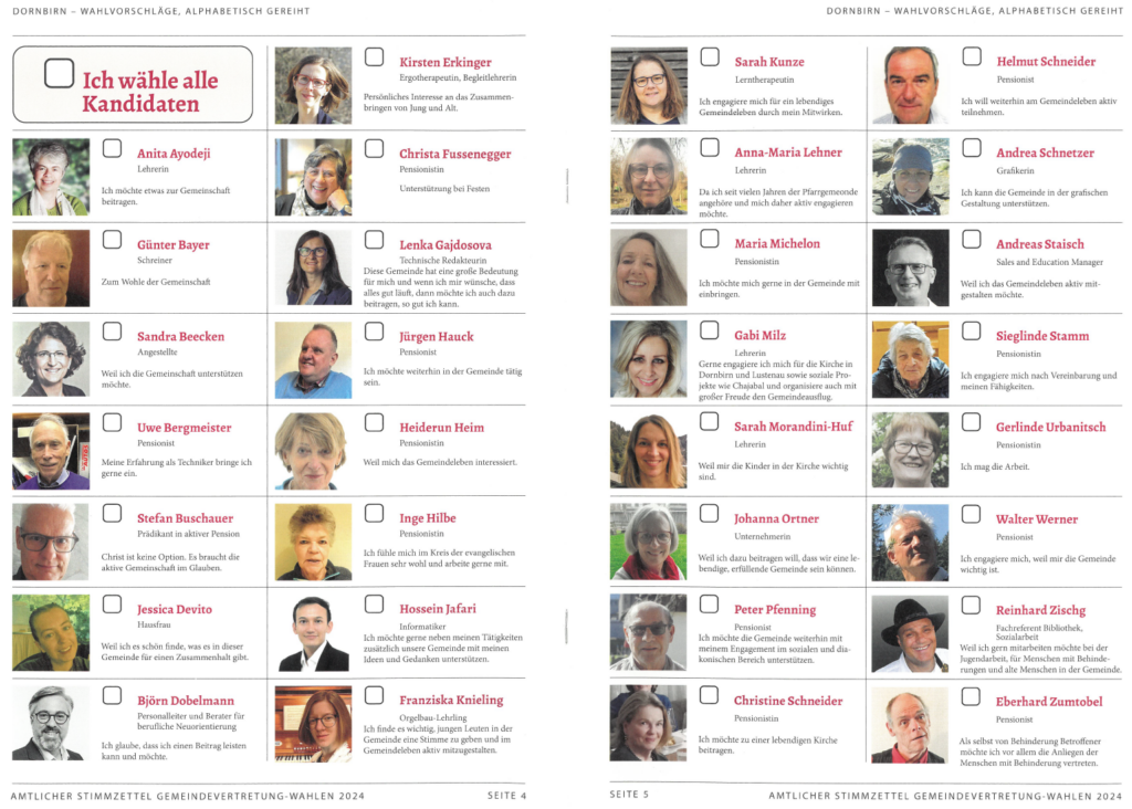 Alle 6 Jahre wird in der evangelischen Kirche aus den Gemeindemitgliedern von Dornbirn, Hohenems und Lustenau, die Gemeindevertretung gewählt. Bei der Wahl am 14. und 21. April 2024 wurden folgende 31 Gemeindevertreter und Gemeindevertreterinnen neu gewählt und am 5. Mai 2025 in der Heilandskirche in Dornbirn angelobt:
