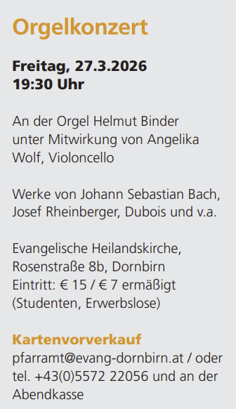 Seit vielen Jahren findet am Freitag vor Palmsonntag in der evangelischen Kirche in Dornbirn ein Orgelkonzert mit Helmut Binder statt. Das Besondere hier ist, dass der Spieltisch der Orgel auf Zuhörerebene positioniert ist, wodurch man das